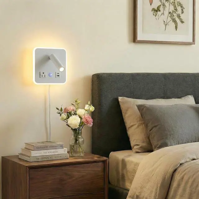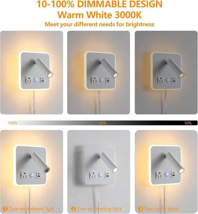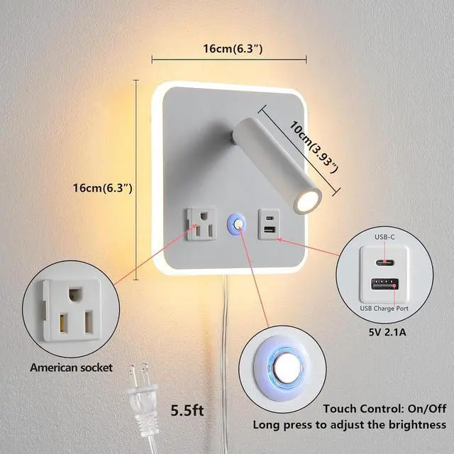 Fast USB C+A PortsThe plug in wall sconces is designed with 2 USB charging ports(5V/2A) on the base, You can charge two devices at once, Very useful to charge your mobile phones, tablets, smartwatch. The USB port functions regardless of whether the bedside reading lamp is On or Off.