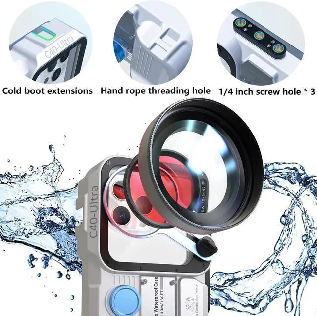 40M waterproof depth rating Bluetooth Connection - "shutter"button and joystick control Tripod mount for professional stabilization Universal fit (phones up to 6.9" ) Air bubble design for screen clarity Upgraded HD shooting large window, suitable for various mobile phone models of camera