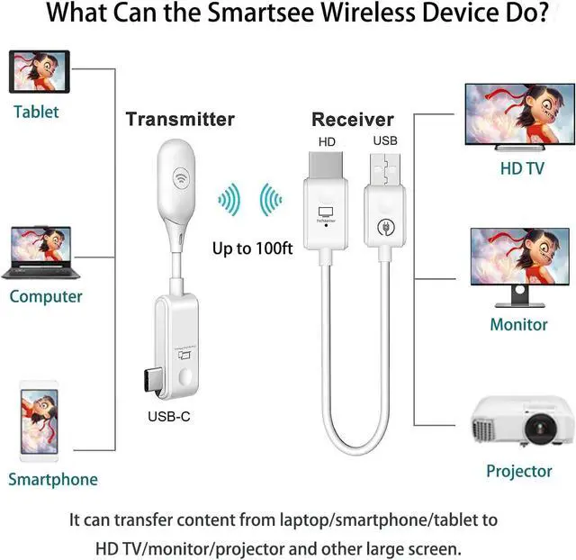 Excellent Distance Transfer Performance - 0.07 s Low Latency. The Wireless HD Transmitter and Receiver is equipped with powerful long-distance signal transmission, provides a stable transmission with a long-distance transmission range of up to 170FT. Enjoy stable screen mirroring and screen extending.