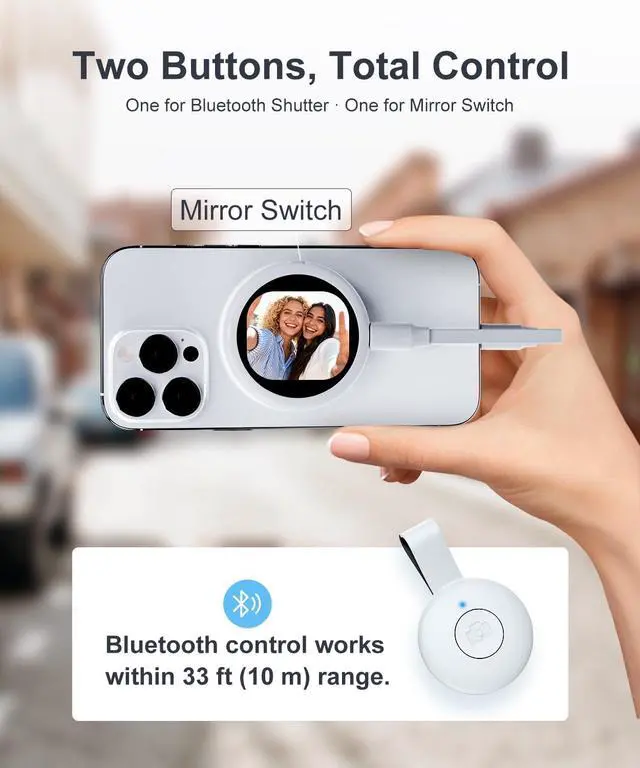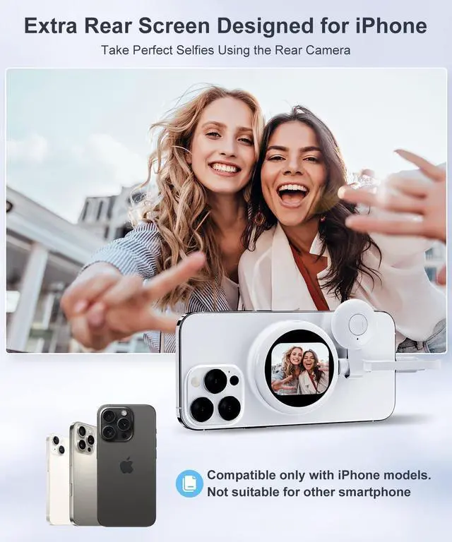 Lightweight with Remote Control- Its featherlight design maintains your natural phone grip, while remote lets you shoot hands-free selfies or group videos from a distance. Magnetic selfie screen draws power directly from the iPhone and uses only 0.8 Wabout 5% battery per hourmaking it ideal for long recording sessions, extended vlogs, or continuous back camera selfie monitor shooting
