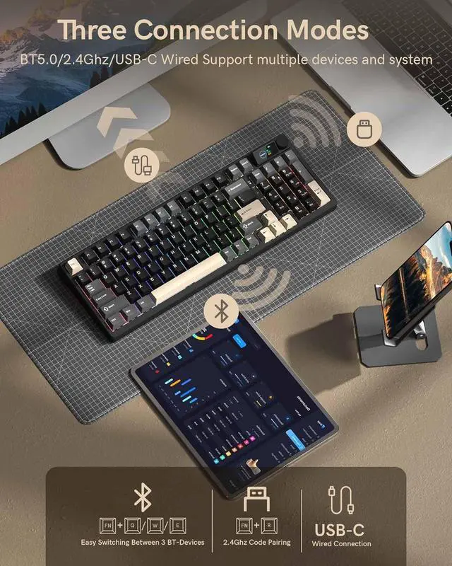 Practical Knob OperationThis wireless keyboard is equipped with a multi-function knob for switching display interfaces and adjusting volume. The ergonomic design simplifies control and enhances user convenience in daily use.
