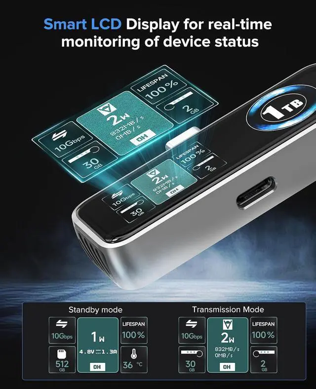 Intelligent LCD DisplayZ791C's intelligent LCD display can monitor the device status in real time, including important parameters such as transfer rate, hard drive condition, Charging voltage and current, operating temperature, etc. to better understand the operating status of your device. The display also has a unique breathable RGB light effect.