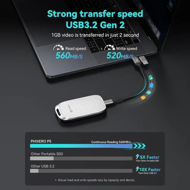 P5 1TB External Portable SSD combines blazing speed, rugged durability, and versatile compatibility to meet all your on-the-go storage needs. With a 5Gbps USB C interface, it transfers large fileslike 4K videos or game installationsin seconds, 10x faster than traditional external hard drives. The 1TB capacity offers ample space to organize photos, videos, documents, and games without compromise. Built to withstand the rigors of daily use, the P5 features the ability to resist drops up to 5ft ( 1.5 m), along with protection against spills and dustmaking it a reliable companion for travel, outdoor activities, or commuting.