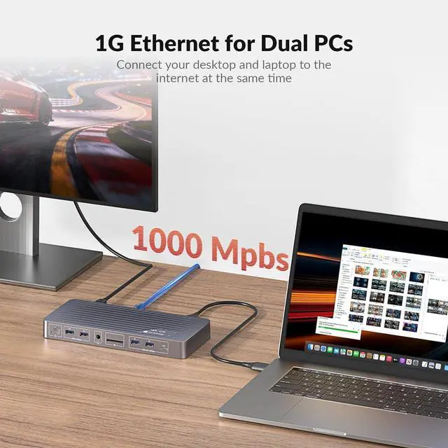 100W PD& Always-On Gigabit Ethernet Featuring 100W USB-C Power Delivery, it keeps your MacBook at full charge during intensive tasks. The always-on Gigabit Ethernet ensures both connected computers remain online simultaneously, preventing network dropouts during KVM switching for continuous downloads and updates.