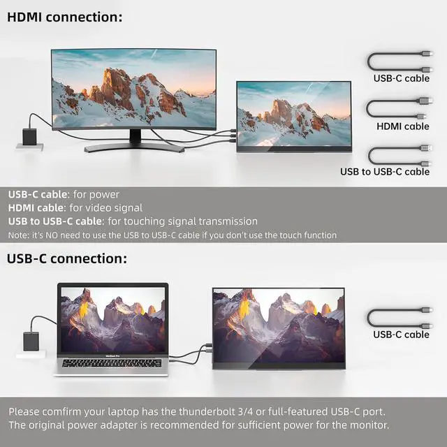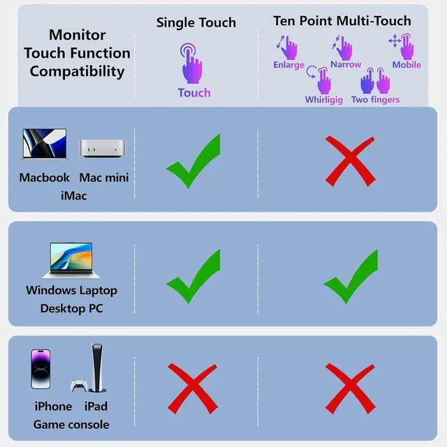 To use the Touchscreen: 1)When using HDMI cable for display, please use the USB-A to USB-C cable to connect your Windows laptop/computer PC to the monitor for touching signal. 2)10-point Touchscreen is only supported on Windows, and is NOT supported on MacOS. 3)iPad, iPhone, game consoles (PS4, PS5, Xbox,... ) do NOT support touchscreen