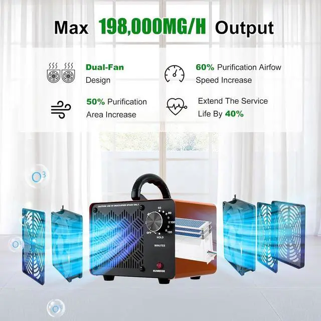 Versatile Applications \ 360° Odor EliminationThe advanced dual-fan design provides complete 360° ozone coverage, even in irregular spaces. Perfect for homes, cars, offices, commercial spaces, boats, basements, smoking areas, and pet rooms