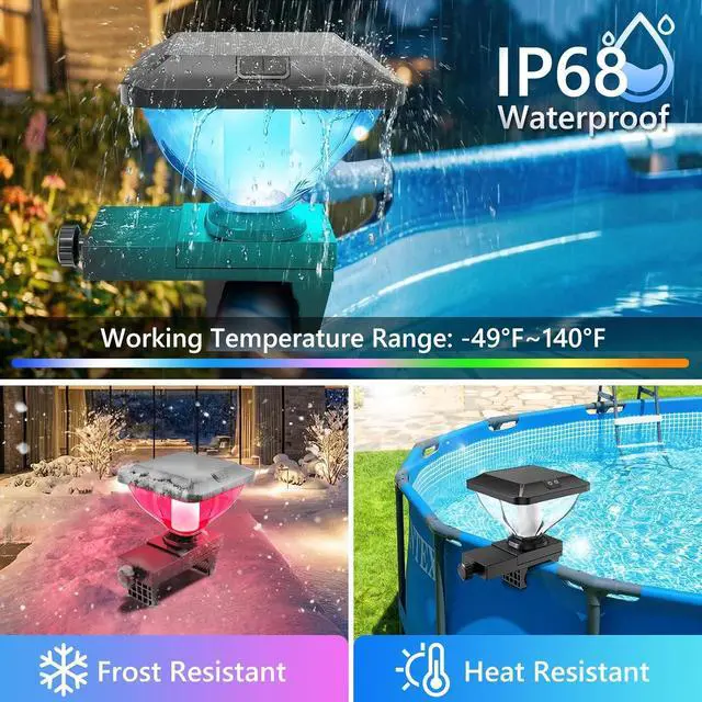 Timed Convenience & Memory Function: The default 5-hour auto-off timer ensures the solar powered pool light switches off when you need it to, hassle-free & energy-efficient. With memory function, set your own light once, enjoy fantastic free all the time