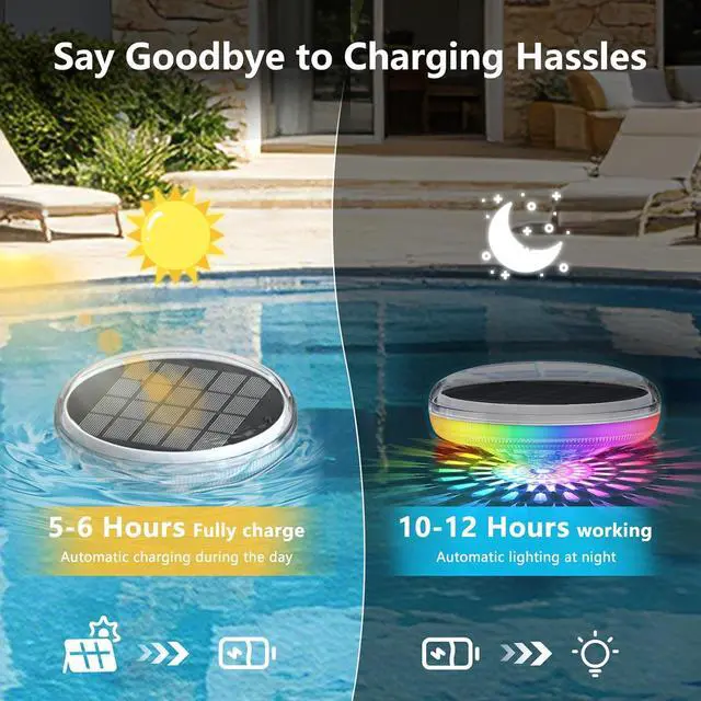 Dynamic RGB Floating Lights: Solar Pool Lights with 3 Dynamic RGB Lighting Modes + 9 Static Lighting Modes, Floating Pool Lights are the preferred choice for swimming pools, spas, hot tubs or gardens with Dynamic RGB Lighting Effects. Whether it's Christmas, Valentine's Day, weddings or a romantic evening. They add fun and romance, turning any occasion into something special.