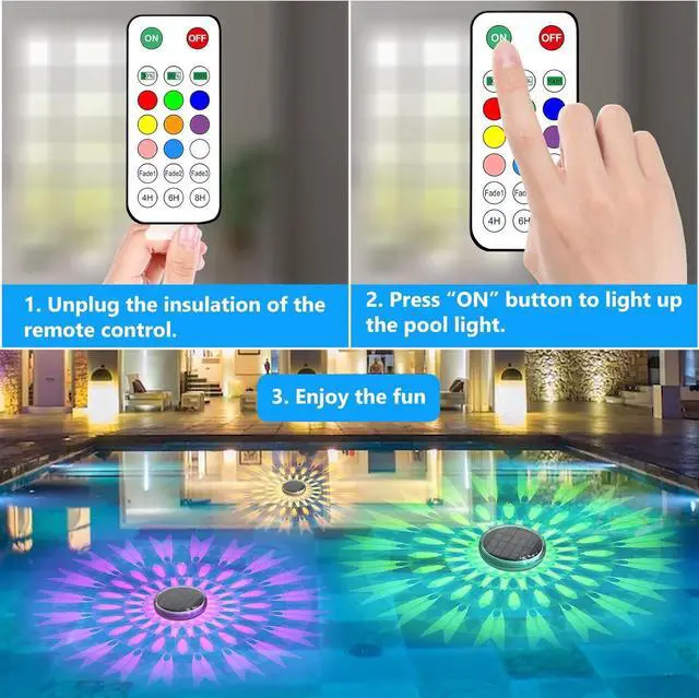 2-Years Repair & Package: provides a no-risk refund and 2-year repair, please rest assured to buy. If you have any problems about pool lights, please feel free to contact us, our service team is available 24 hours a day. What You Get? 2*floating pool lights, 1*Remote, 1* Instruction Manual.