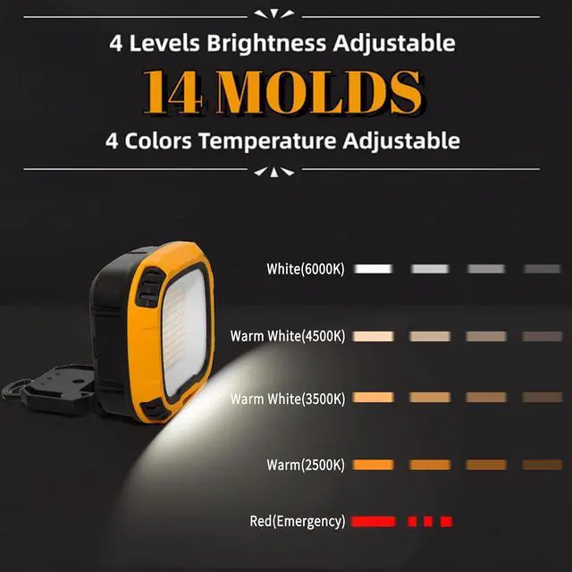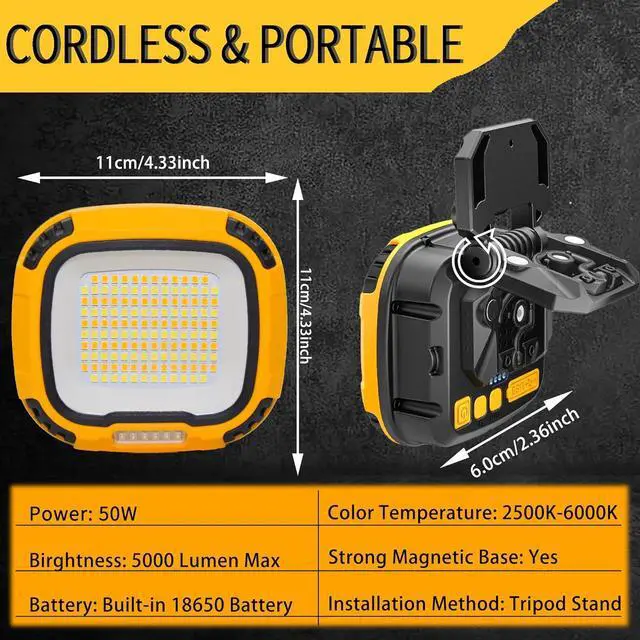 IPX4 WATER-RESISTANT & MULTI-SCENE USE - From the garage to the great outdoors, this rechargeable battery powered construction lights (a portable work light and portable led work light) is your ideal companion. It's perfect for outdoor work light scenarios and activities like camping, hiking, barbecues, auto work light use, car repairs, shop work light needs, workshop, warehouse, vehicle detailing and even sos emergency light. Its also a work light battery powered and led rechargeable work light, with waterproof design ensuring it performs flawlessly in various environments, be it rain or snow.