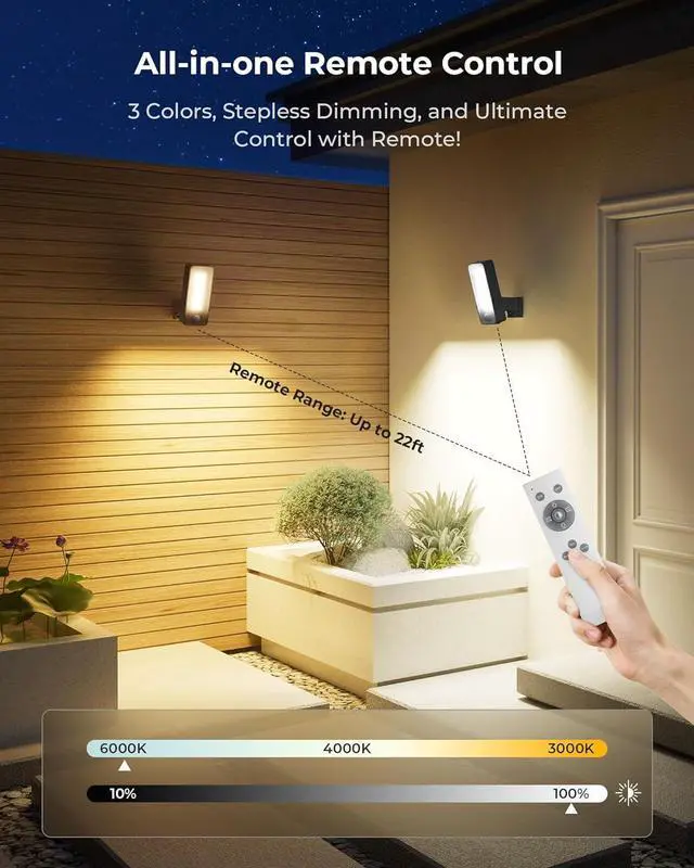 Remote Control: The included remote control allows you to easily manage your outdoor motion sensor lights. You can switch modes, adjust the brightness, switch between 3 color temperatures, and set a 30- or 60-minute auto-off timers. Plus, the memory function remembers your last settings every time you power on. (Remote requires 2 AAA batteries, not included). Please aim the remote directly at the IR receiver on the front of the light to ensure proper operation.