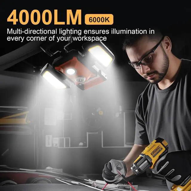 Folding: Designed for ultimate convenience, the two side lights on this cordless work light fold 180° and rotate 350°, while the main light folds and rotates 360°. This versatile work light ensures you have full control over your lighting angles, making it ideal for a variety of work environments.