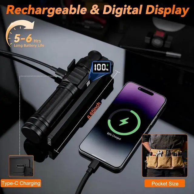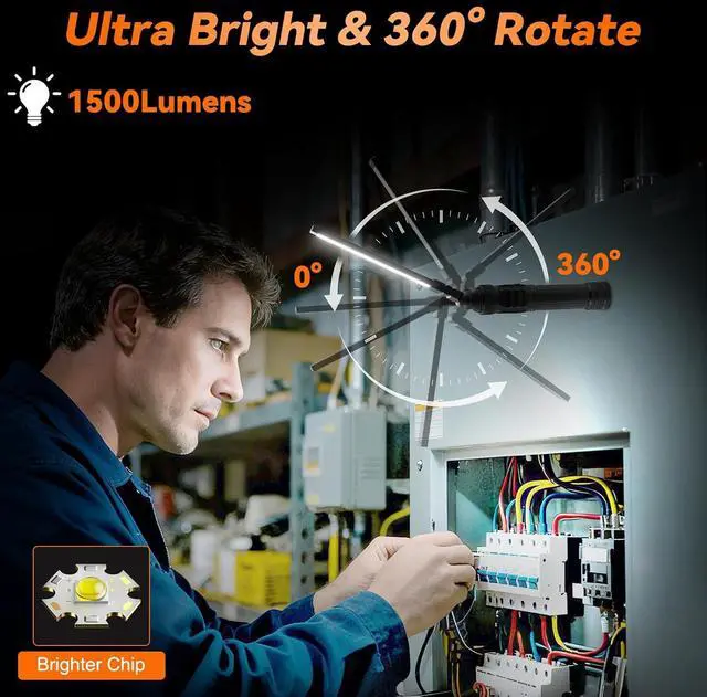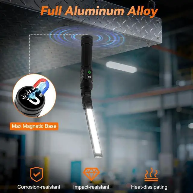 Hands-Free & Aluminum Alloy: With an upgraded super-strong magnetic base, this magnetic flashlight enables easy hands-free use, freeing you to focus fully on work. What's more, the magnetic work light has an all-aluminum alloy body that offers excellent impact resistance and efficient heat dissipation, ensuring reliable lighting performance over long working time.