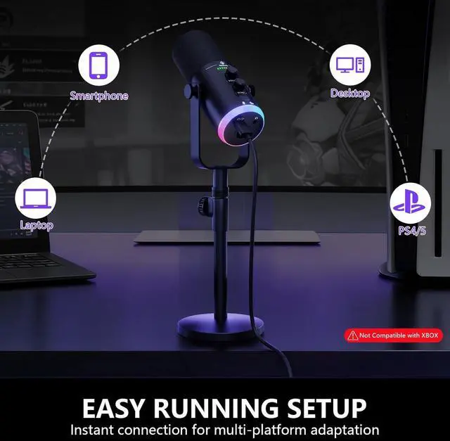 Pro Monitoring & Universal Compatibility 3.5 mm headphone jack + adjustable monitoring volume for real-time vocal feedback; smooth gain knob for precise audio adjustment, cutting down post-production work significantly. Fully compatible with PC, Mac and PS5 (suggest connecting to PS5 back USB-A port), with a sturdy desktop stand included for stable use.