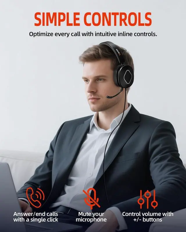 INLINE CONTROLS: Convenient volume adjustment and mute functions integrated into the cable for quick access during calls PROFESSIONAL QUALITY: Ideal for call centers, remote work, virtual meetings, and gaming with clear stereo sound output