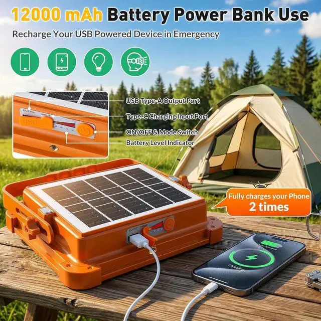 12000LM Bright LightEquipped with 474 high-intensity LED beads, this solar light delivers a stable 12000 lumen output that is brighter and more even than those with fewer LEDs and lower lumens. The transparent glass cover maximizes light transmission while ensuring soft, flicker-free illumination that reduces eye strain during long hours on the job. Whether on construction sites, in auto repair shops, or at nighttime outdoor activities, this portable work light provides consistent, reliable lighting to enhance both safety and productivity.