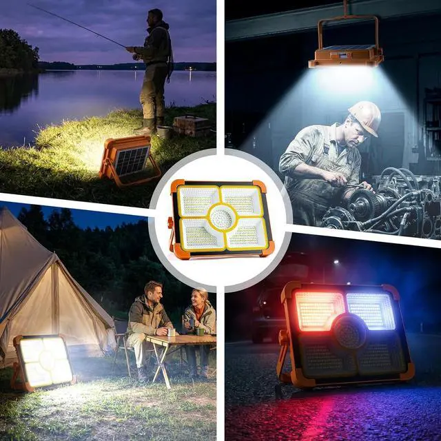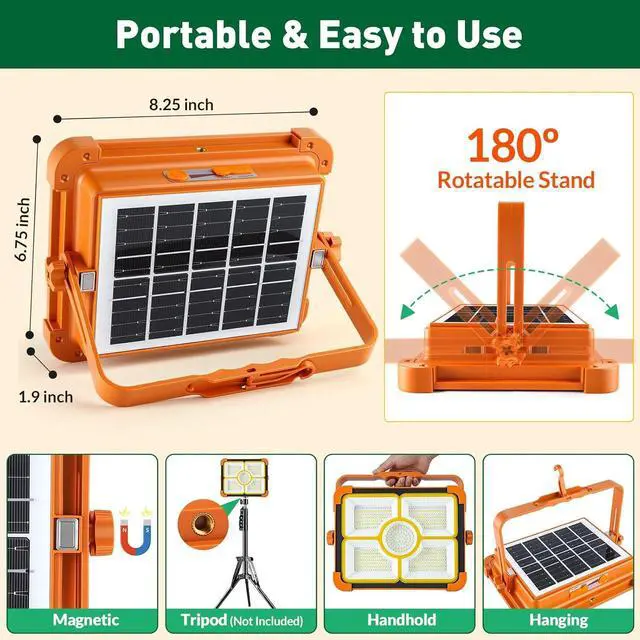 Flexible installation & Carrying MethodsThis work light designed with a comfortable handle for handheld use, a stable base for freestanding, a hook for hanging in tents or work areas, and a strong magnetic back for attaching to metal surfaces like car bodies and toolboxes. This solar flood light also comes with a standard screw interface compatible with a tripod (not included) for elevated wide-range lighting. This multi-style design adapts to various scenarios such as job site work, camping, hiking, fishing, roadside assistance, and household emergencies.