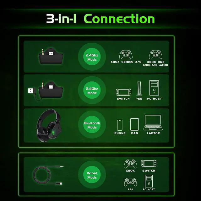 Triple-Mode Connectivity: Captain 560 xbox headset wireless connects seamlessly across devices, whether youre gaming on Xbox Series X/S, PC or PS5. Choose the mode that fits your setup 2.4GH z wireless for lag-free console play, Bluetooth 6.0 for mobile convenience, or 3.5 mm wired for universal compatibility