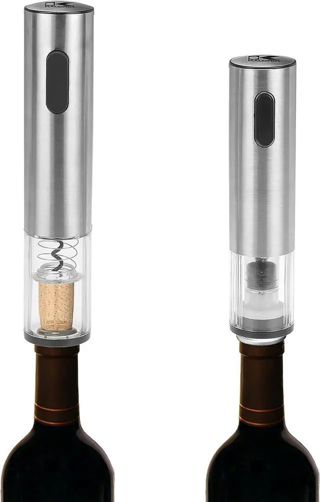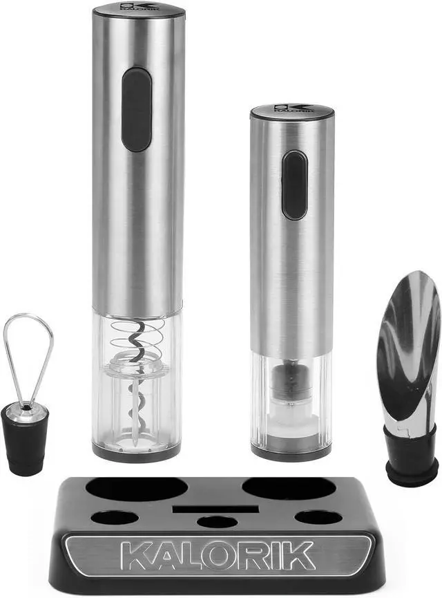 Includes: cordless rechargeable wine bottle opener + rechargeable cordless wine preserver, along with a foil cutter, wine pourer, and 2 wine stoppers