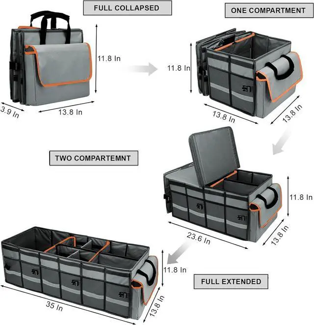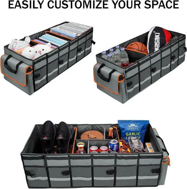 Adjustable size, according to your detailed placing area, this trunk organizer can be adjusted from large size to small size to fit the storage area.
