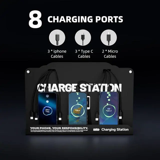 Complete Package: Includes 1 charging station, 8 charging ports, 1 AC adapter, 1 power cord, mounting screws And free cables for Spare, providing everything you need for quick and easy installation.