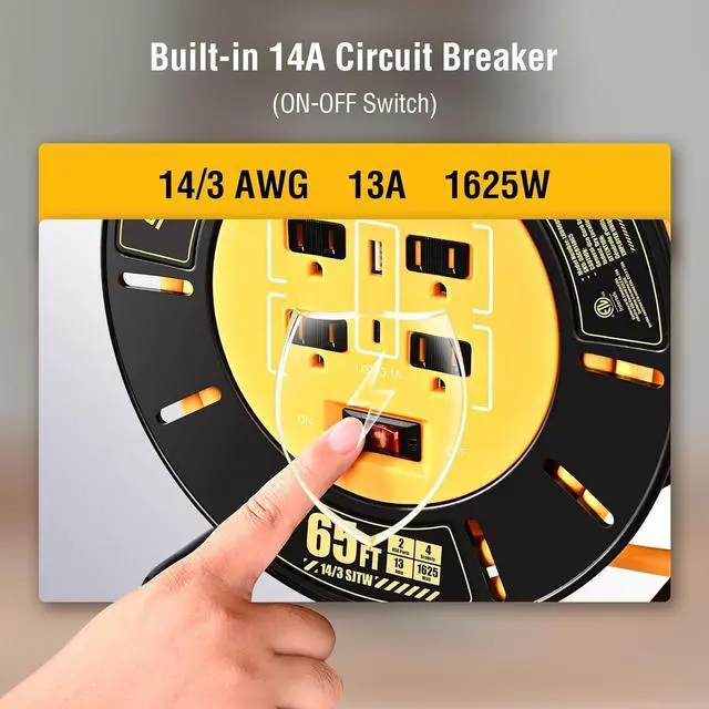 Safe Use: Extension cord on reel protects your electrical equipment with a safety overload circuit that automatically shuts off when overloaded. Easily reset the power with the on/off switchno unplugging required