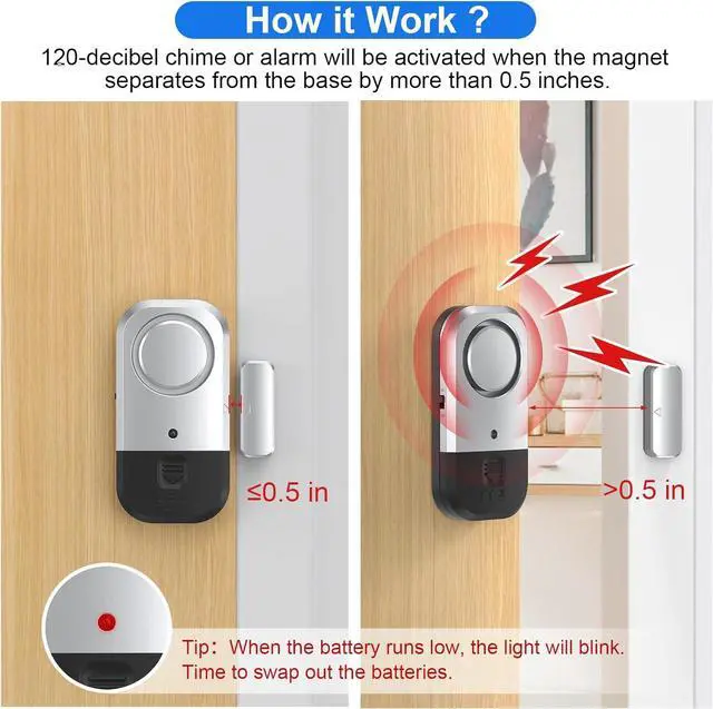Longer Battery Life - Our door window alarms with a low battery indicator, ensuring you know when to replace the batteries. No worries about the alarm failing to work. (4xLR44 batteries included per alarm) Additionally, we include 6 extra backup LR44 batteries, providing extended peace of mind.