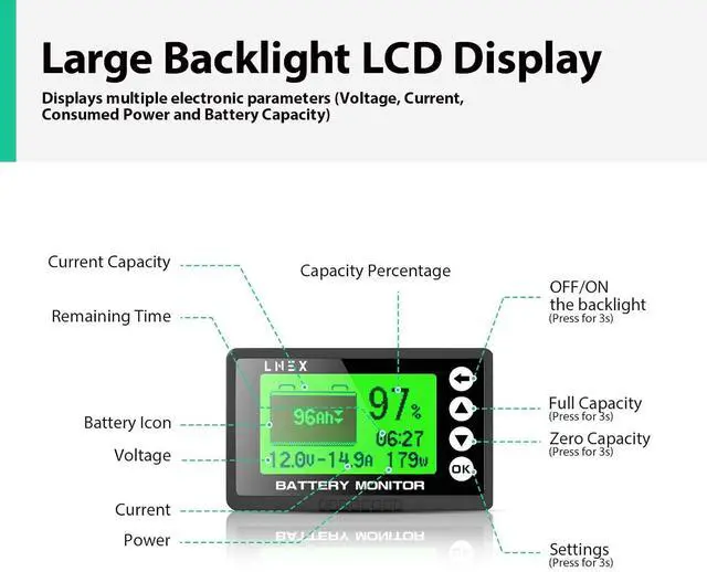 Universal Battery Monitor: Our 12V battery monitor tests multiple electronic parameters (Voltage, Current, Consumed Power and Battery Capacity), with the Voltage range 10V-120V and up to 500A and compatible with various types of battery: Lead Acid, Lithium Iron Phosphate, Lithium-ion, Nickel-metal hybrid. Attached with 26ft Shielded cable allows you to monitor the battery status from distance.