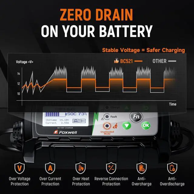 Know Your Battery Health Before Charge with 2-in 1 Charger & Tester Don't waste hours charging a dead battery thats already failed. Unlike standard chargers, BC521 acts as a professional 12V car battery tester, giving you instant LCD data on Voltage, SOH (State of Health), SOC, Cranking Performance and Alternator Output. This digital battery analyzer tells you exactly if your battery is ready for a spring road trip or if its time for a replacementsaving you from unexpected breakdowns and expensive towing fees.