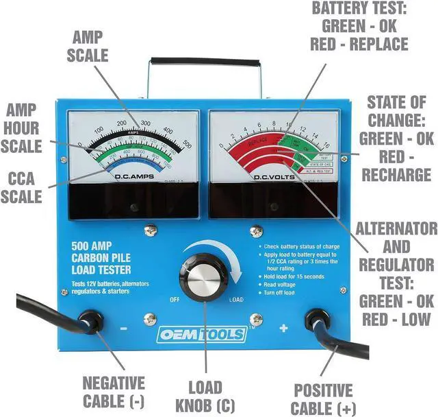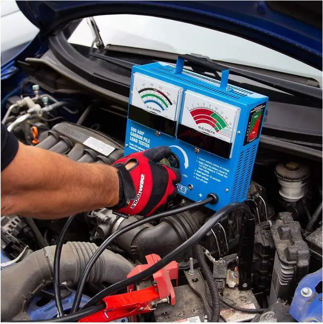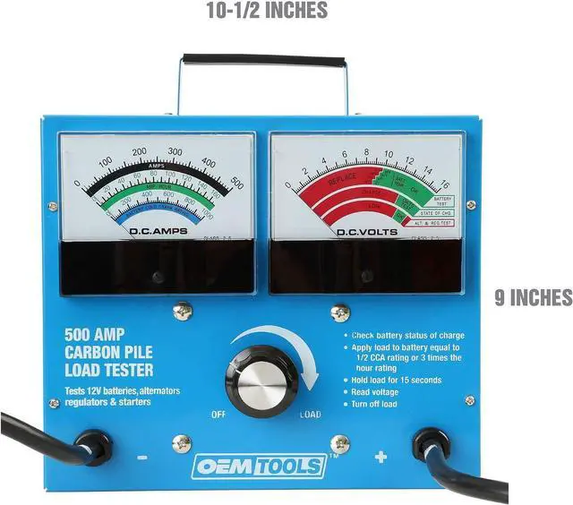 The 500 Amp 12 Volt Battery Load Tester is designed to easily test load, battery condition, or starter motor draw. Our 12 volt battery tester tests alternators and batteries up to 1, 000 CCA in a wide variety of vehicles, such as cars, trucks, golf carts, motorcycles, ATVs, and more. This carbon pile battery load tester features (2) 4.5 inch analog meters to display amps and volts, and a manual adjust control knob for precise load control. Our battery and alternator tester includes gauges that are large and easy to read. The dual gauges on this auto battery tester make it simple to manage testing and observe results. This car alternator tester features a variable load capacity up to 500 amps. Our heavy duty battery tester comes with clamps that easily penetrate corrosion and buildup on battery posts, ensuring more accurate readings on corroded battery terminals than other car battery testers provide. The automotive battery load tester buzzes after load has been engaged for 15 seconds and finishes with a 1-minute cool-down period. Our alternator tester automotive tool allows 3 tests in 5 minutes.