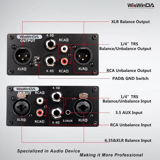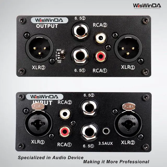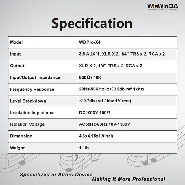 Input: 3.5 AUX*1, XLR X 2, 1/4" TRS x 2, RCA x 2 Output: XLR X 2, 1/4" TRS x 2, RCA x 2 Input/Output Impedance: 600 / 10K Frequency Response: 20Hz-50KHz (±0.2db ref 1khz) Level Breakdown: 0.7db (ref 1khz 1V rms) Insulation Impedance: DC1000V 100 Isolation Voltage: AC50Hz-60Hz / 0V-1500V