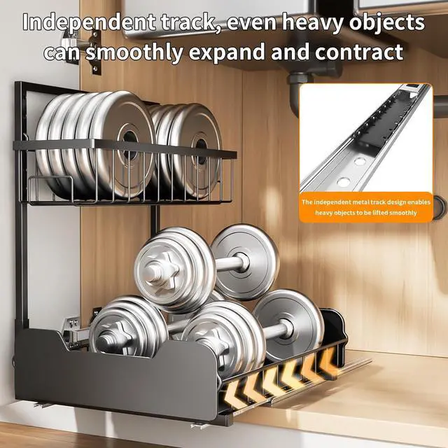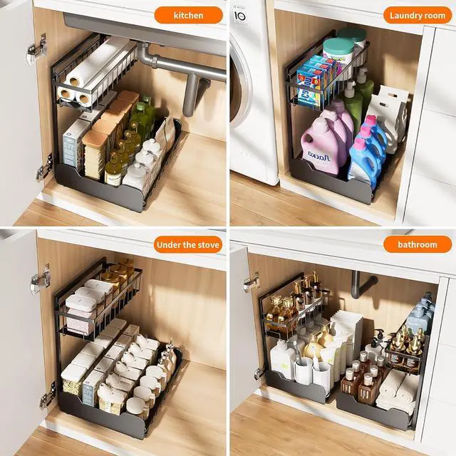 VERSATILE & CUSTOMIZABLE ORGANIZER Dimensions: 13.6"L x 10.2"W x 14.6"H (Adjustable). The spacious bottom basket can hold bottles up to 10.83" tall. Please measure your space before ordering! Perfect for organizing under the sink in the kitchen, bathroom, and laundry room, keeping cleaning supplies, toiletries, and more neatly stored and within reach