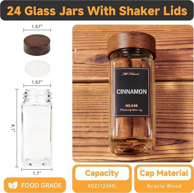 Glass Jars & Labels: Each of the 24 glass jars can hold 4oz of spices. The 2-in-1 shaker lid features both sift and pour tops, making it easy to use for light seasoning. The product also includes 184 pre-printed spice labels and 32 blank labels for DIY, making it easy to find the spice you need while cooking.