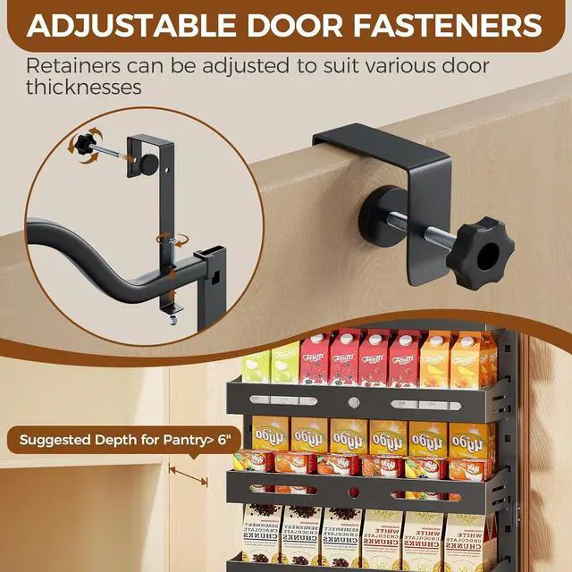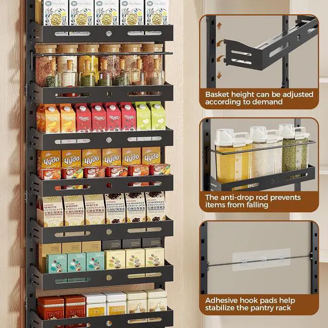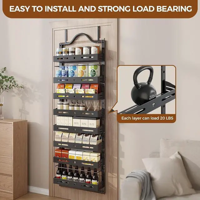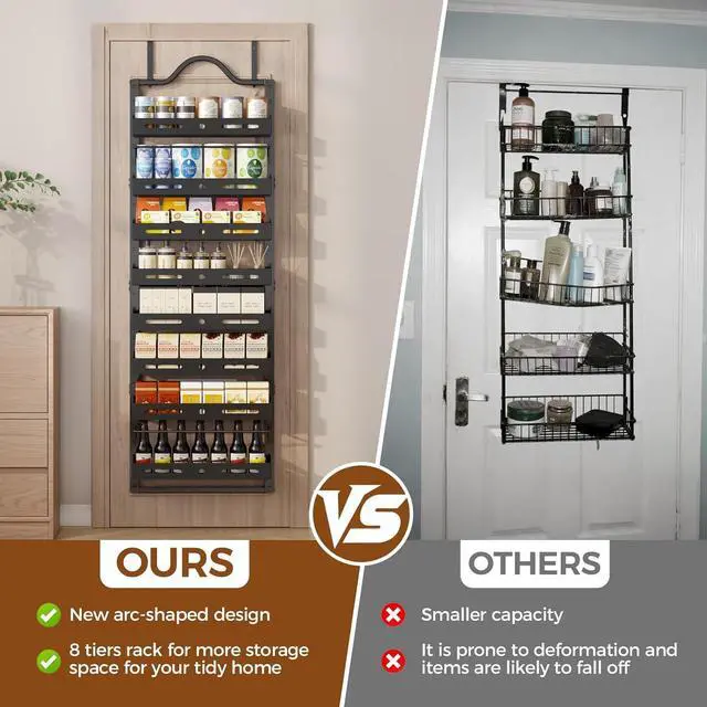 Durability: The over the door organizer is made of thickened, anti-rust steel, with a stable structure that will not shake or deform. The hanging door spice rack is specially designed for cabinet doors and walls has undergone strict testing. Each basket can bear a load of up to 20 pounds. The metal pantry door organizer enhanced strength and longevity with upgraded welding points and coating.