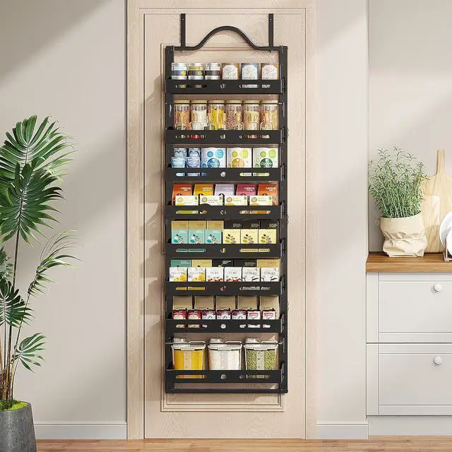 8-Layer Adjustable Door Pantry Organizer: This black wall mount spice rack can maximize the use of your space, 8 Tier door shelves of basket height can be adjusted, suitable for storing cans, spices, snacks and other different sizes of items to meet your storage needs.
