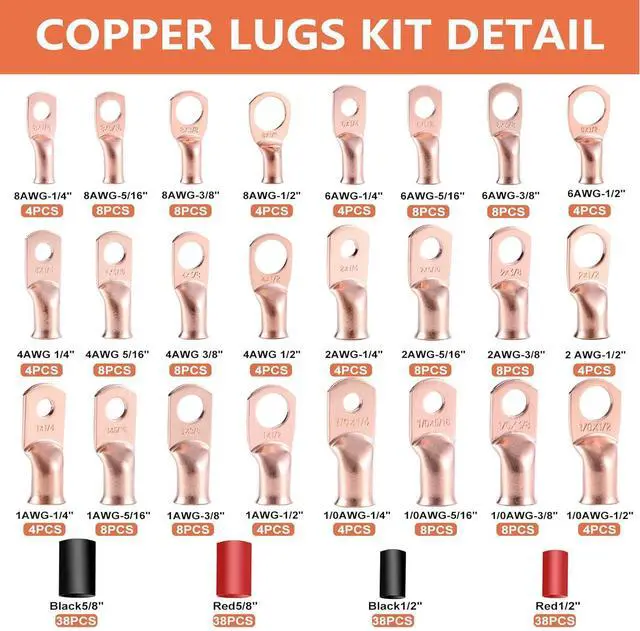 Ideal for: Car/Truck Battery connections, Solar Panel wiring, Boat and Marine electrical, RV/Camper systems, Golf Cart batteries, Trailer wiring, Audio Amplifier installs, and DIY power projects. The 8 to 1/0 AWG copper lugs assortment covers the most common stud sizes