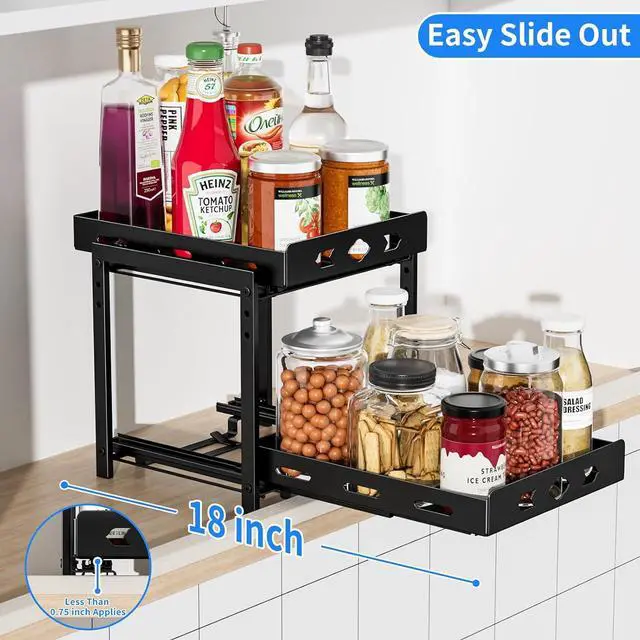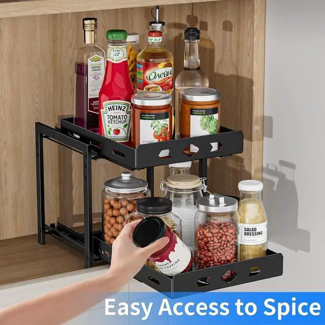 Independent Slides: The spice rack made of high quality metal, not easy to deform the surface is painted to prevent rusting. Shelf design, spice jars will not tip over or fall out of the basket when the spice rack slide out. Ensure spice jars are neatly arranged. The upper and lower baskets slide independently of each other, making it easier to find and reach the spices.