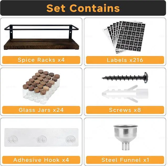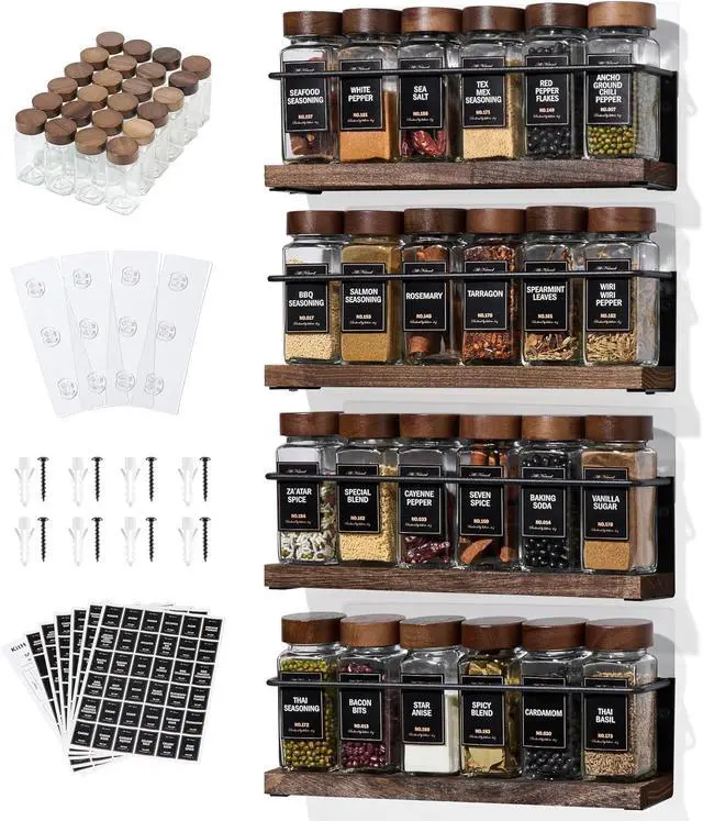 Multifunctional UseMore than a wall spice rack! This spice rack organizer doubles as a kitchen shelves, pantry organizer, seasoning organizer, and tea storage rack. The jars are suitable for storing spices, nuts, and grainsoffering a stylish, functional spice organizer to meet all your multi-scene storage needs.