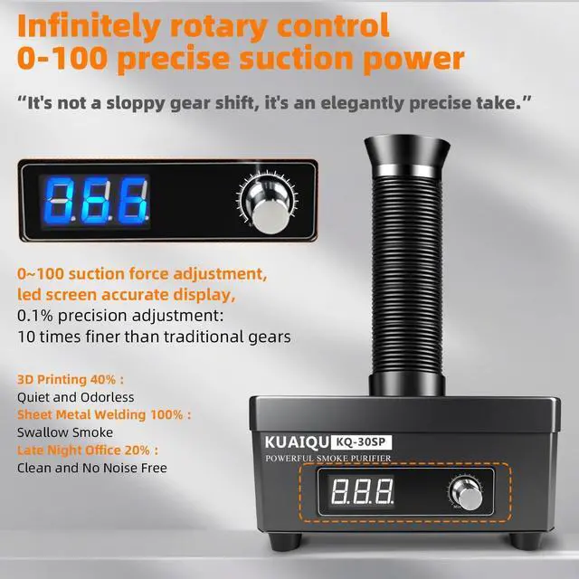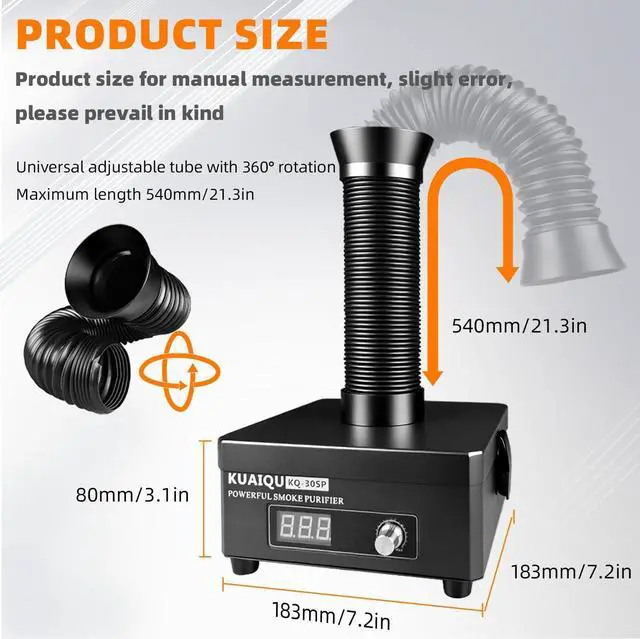 Flexible: The solder fume extractor measures just 7.9 * 7.9 * 4.3 inch and weighs only 2.1 kg, saving workspace while efficiently keeping your air clean. Fume extractor's 360° adjustable extraction hose. Easily position it in any direction to capture smoke and dust directly at the source, ensuring a cleaner and safer workspace with effortless maneuverability