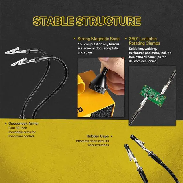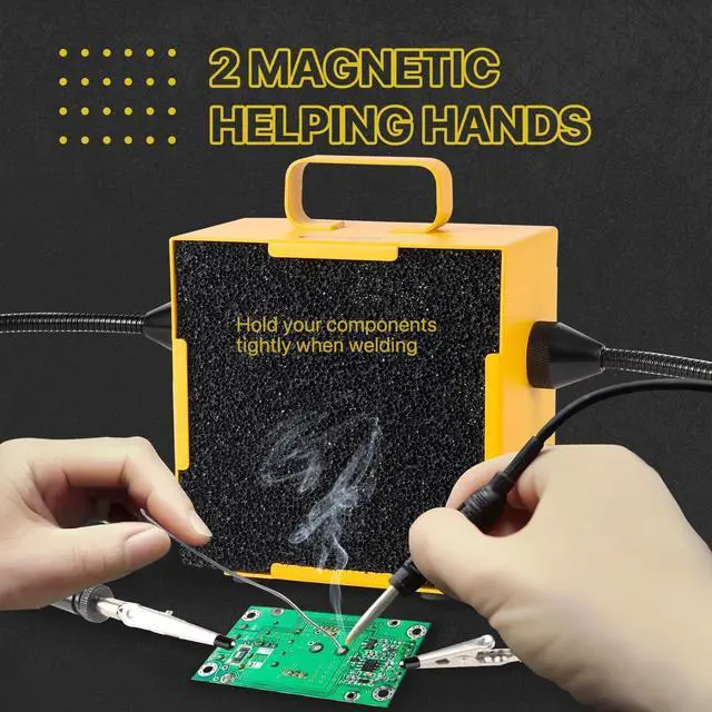 Adjustable Helping Hands: The set includes two magnetic adjustable metal gooseneck arms and stainless steel alligator tip clamp assisting hands. These flexible magnetic arms can hold and assist in soldering components of different shapes, wires, and circuit boards effectively