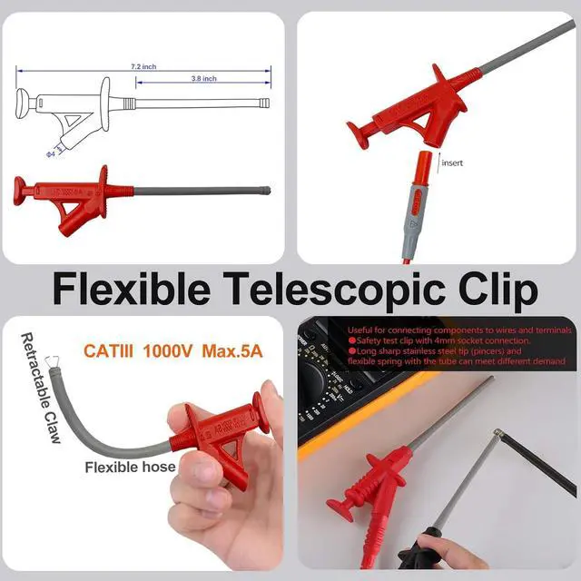[Package List] 1x Multi-purpose test tweezer probes; 2 x banana plug multimeter leads; 2 x multimeter pens; 12 x wire piercing probes set; 2 x banana plug to test hook test leads; 4 x Alligator Clips; 2 x high voltage test hook clips; 2 x 2MM Banana Jack To Back Probe Pin; 1 x 6 Pockets Roll Up Tool Bag.