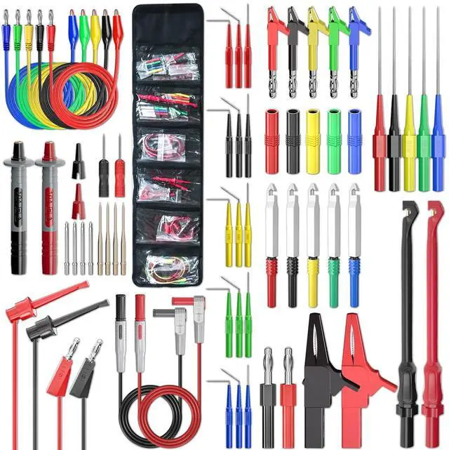 List: 5PCS banana to alligator test leads, 2PCS multimeter leads, 8PCS replaceable probes set, 2PCS inner spring short needles, 2PCS banana to test hook wires, 15PCS back probes set, 5PCS insulated alligator clips to banana male, 5PCS banana female to female connector, 5PCS piercing probes with sheath, 5PCS lengthened wire piercing probes, 2PCS 4mm male to 2mm female adapters, 2PCS heavy duty alligator clamps, 2PCS insulation piercing probes, A six accommodating position folded package.