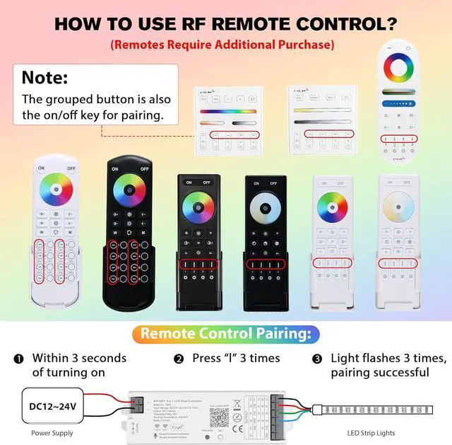 The package includes: a 5 channel LED controller, a RF remote control (without battery). No power adapter and light strip