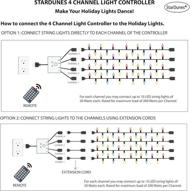 Works with LED and incandescent lights. Connect at least 3 to 4 lights per channel to have professional looking light effects. Rated for 200 Watts per channel; can connect multiple lights to the same channel.