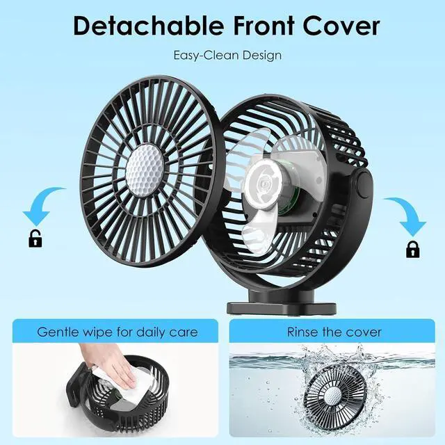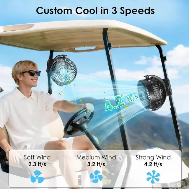 Full 360° Rotation & Easy Portability This golf cart fan features a fully flexible head that swivels 360°both vertically and horizontallyso you can direct the airflow exactly where you need it. It comes with a handy storage bag for easy transport, and its compact dimensions let it fit neatly into your backpack, golf bag, or cart organizer without taking up much space.