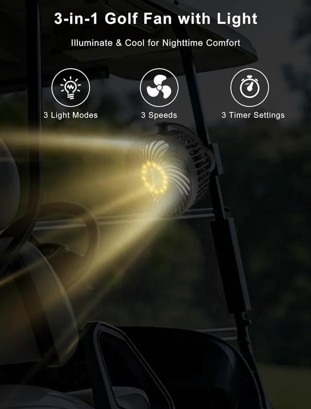 Versatile for Multiple Uses & Lighting OptionsThis golf cart fan is designed to attach securely to any metal surface, making it perfect for golf cart accessories, forklifts, cruise ships, workbenches, kitchens, gym equipment, and even trucks or RVs. The 3-level adjustable LED light makes it an excellent cooling solution for camping, fishing, or power outagesalso a great summer golf gift for family and friends!
