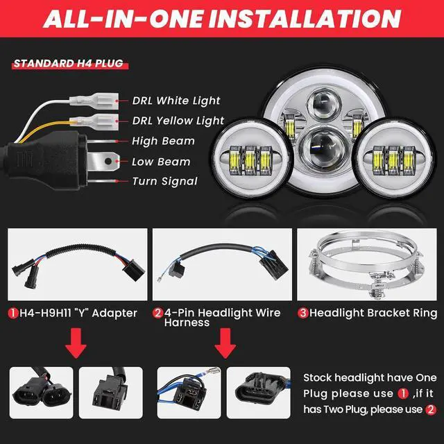 Quality Material For Durable Structure7 inch motorcycle LED headlight assembly is composed of durable PC lens and die-cast aluminium alloy back housing for maximum shock- and vibration resistant and friction, IP67 waterproof and dustproof, long lifespan over 50, 000hrs even in harsh environments can work properly. The high-quality PC lens has a light transmittance of more than 98%, ensuring safe driving at night. 4 breathing holes for free breathing help 7 inch motorcycle LED headlight to release moisture. All-in-one design for Harley fans, consistent and beautiful appearance.