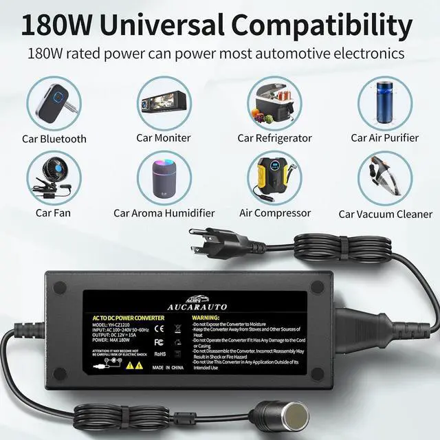 NOTE: Please dont overload this power converter over 180W/15A, otherwise, your device wont work well and the power supply will be damaged very soon; It is normal for the converter to heat up when running for a long time or using high power equipment. If there is deformation or melting, please stop using it immediately.