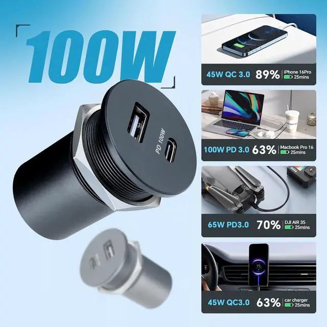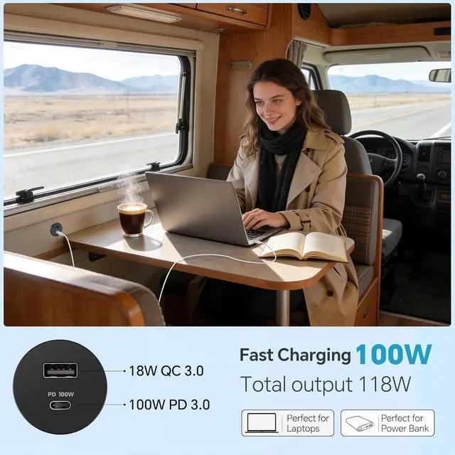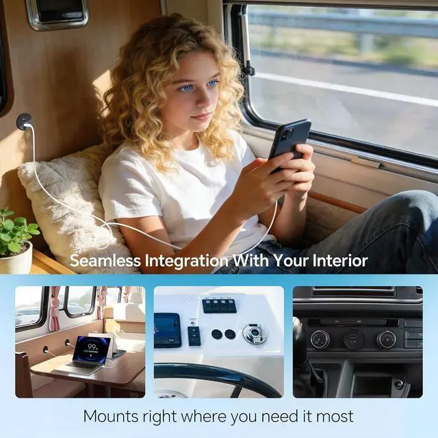Anywhere: Effortless setup! Its pre-wired for quick 12V-24V installationsimply connect it to your battery and secure it with the included nuts. The essential dual high-speed charging hub for powering laptops, tablets, phones, drones, dash cams, and more in RVs, work trucks, boats, campers, and vans. Its backed by a worry-free 3-year warranty.