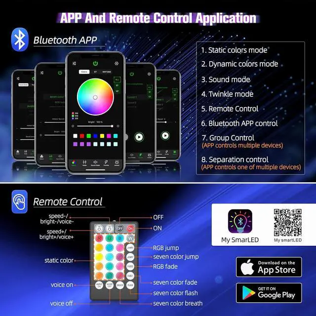 SENSITIVE REMOTE CONTROL+BLUETOOTH APP- Remote Control: 13 static colors (pure white, red, green, blue, etc. )+5 dynamic switching modes (fade, jump, flash, breath, music), you can also adjust the brightness and mode speed. Another control way is Bluetooth APP control, just download the APP and turn on Bluetooth, control a variety of functions and color transformation, and can display 16 million colors, to fashion just the right atmosphere